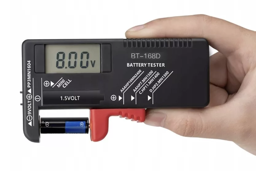 Pomiar zużycia baterii odbywa się przez zetknięcie biegunów + i - baterii / akumulatorka z metalowymi końcówkami testera i odczytaniu wyniku pomiaru na czytelnym wyświetlaczu LCD.