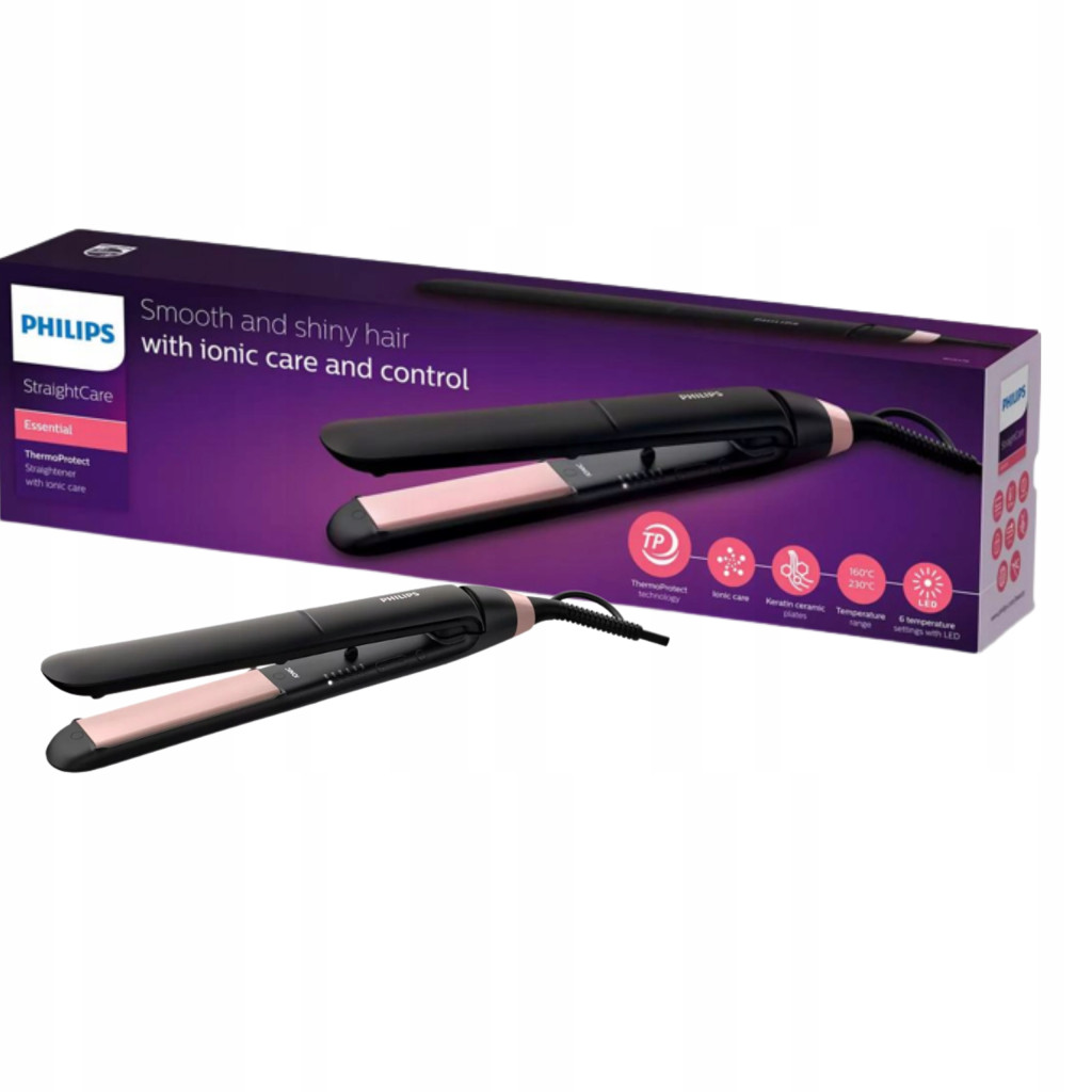 Długie płytki ceramiczne z keratyną i 6 ustawień temperatury LED umożliwiają łatwe i szybkie układanie włosów, technologia ThermoProtect chroni je przed przegrzaniem, a jony nadają im wyjątkowy blask.