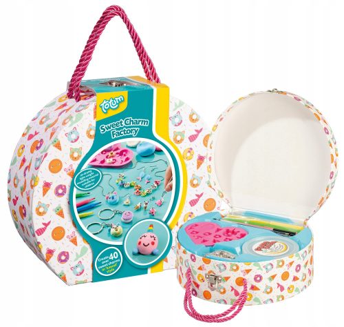 Zestaw kreatywny od Totum: z tą słodką fabryką charmsów w pięknym pudełku upominkowym, zrobisz ponad 40 super słodkich elementów biżuterii w stylu kawaii i modnych akcesoriów. Zrób szczęśliwe zawieszki w kształcie cukierków i pączków, kolczyki i breloki z ciasta piankowego i narysuj na nich uśmiechnięte twarze!
