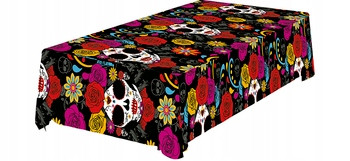 Obrus poliestrowy z serii "Catrina". Nakrycie stołu jest wykonane z czarnego materiału z nadrukiem kolorowych kwiatów. W śród roślinności widnieje nadruk ozdobionych, kobiecych czaszek. Nadruk nawiązuje do meksykańskiego święta śmierci - Dia de los muertos (Day of the dead). Obrus ma prostokątny kształt. Super uzupełnienie dekoracji stołu na przyjęciach z okazji Halloween.