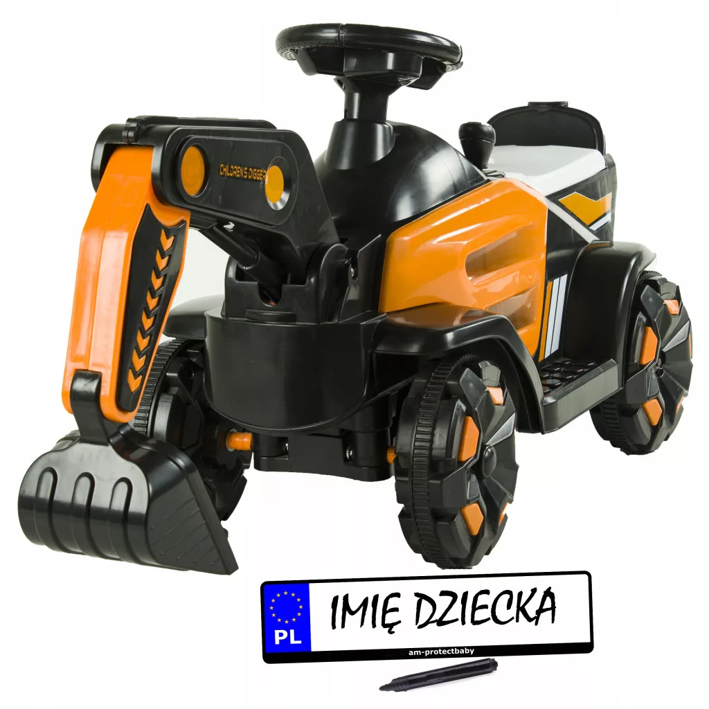 Kupując Koparkę otrzymujesz GRATIS Radość dziecka, Zmywalną tablicę rejestracyjną, Marker i Bezpieczną zabawę.