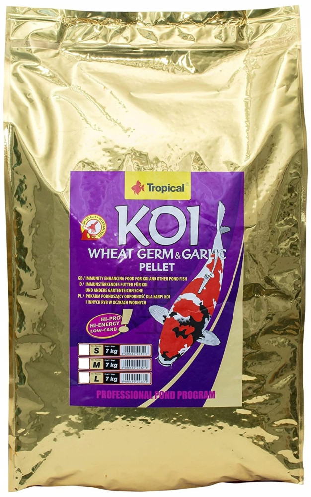 Koi Wheat Germ & Garlic Pellet Size S podawany regularnie utrzymuje ryby w doskonałej kondycji i wpływa na ich równomierny wzrost i rozwój. Pokarm stosujemy od wczesnej wiosny do późnej jesieni, w temperaturze wody powyżej 10°C oraz podczas zimowania niewielkich ryb w pomieszczeniach zamkniętych.