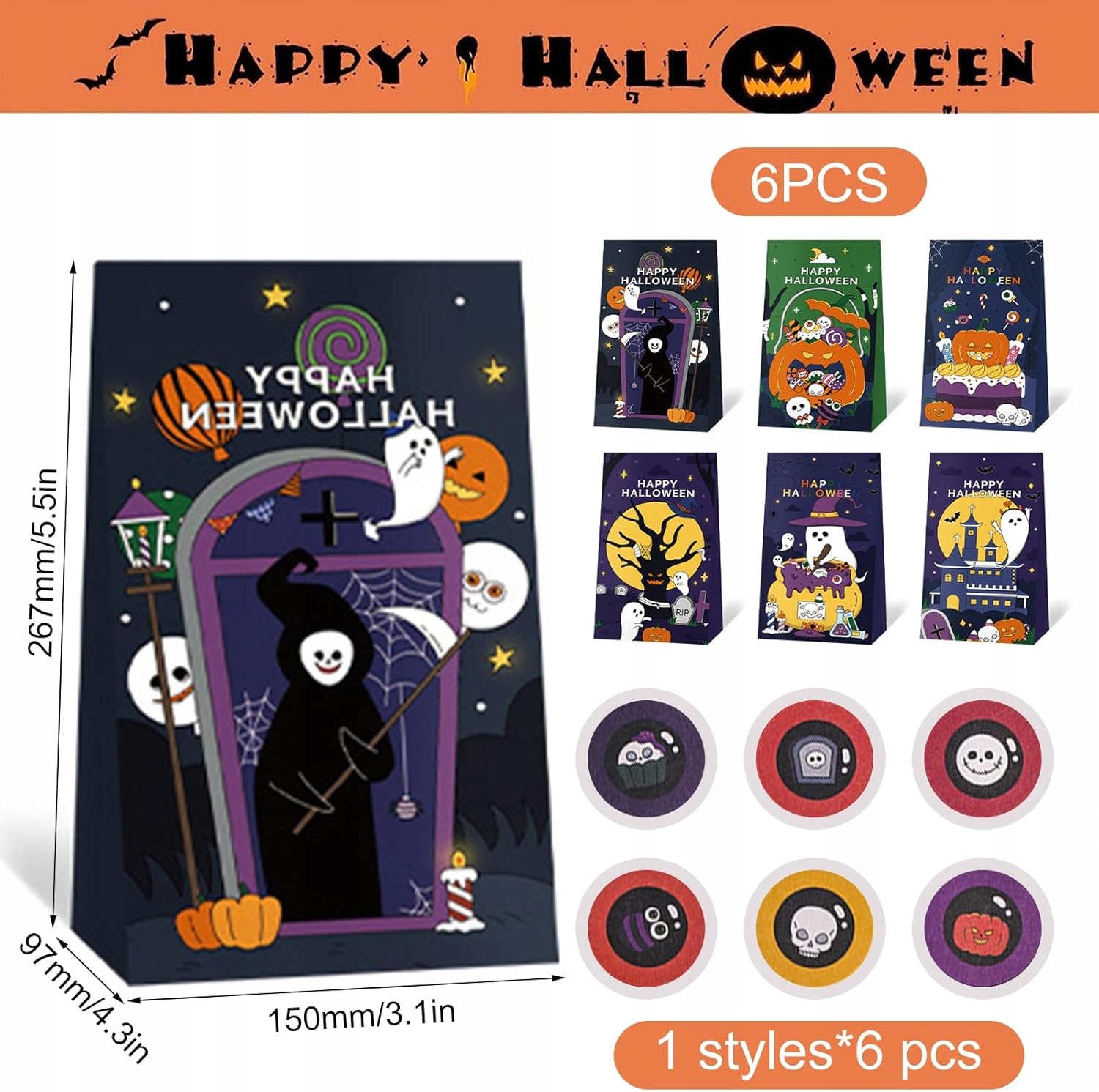 ✅ Otrzymasz 6 torebek na słodycze na Halloween oraz naklejkę do makijażu ust. Wymiary torebek to 150 x 97 x 256 mm, co czyni je bardzo praktycznymi i wygodnymi w użyciu dla każdego.