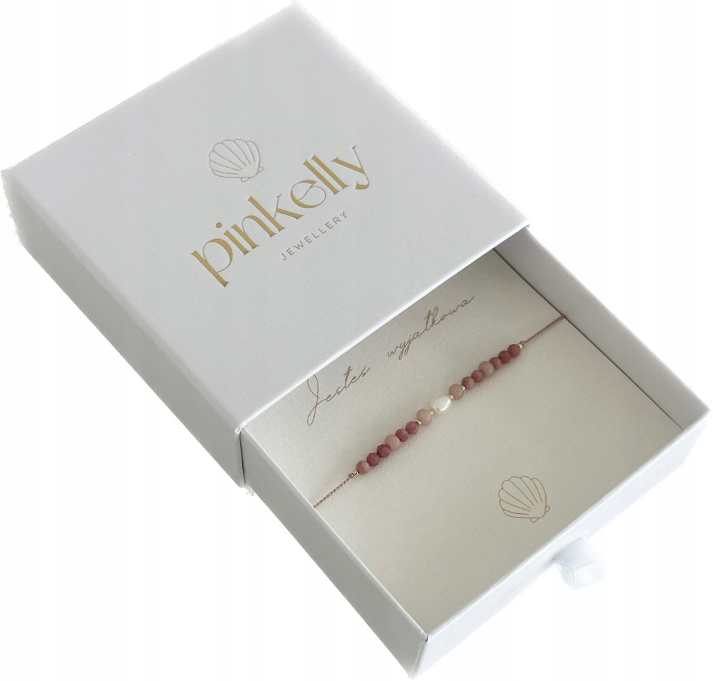 Biżuteria zapakowana jest w luksusowe pudełko jubilerskie, z tłoczonym złotym logo. Całość wysyłana jest w ekologicznym pudełku z różową bibułką oraz elegancką kopertą zamkniętą ręcznie robionym, perłowym lakiem. Dodatkowo istnieje możliwość wybrania opcji pakowania na prezent (torebka prezentowa).