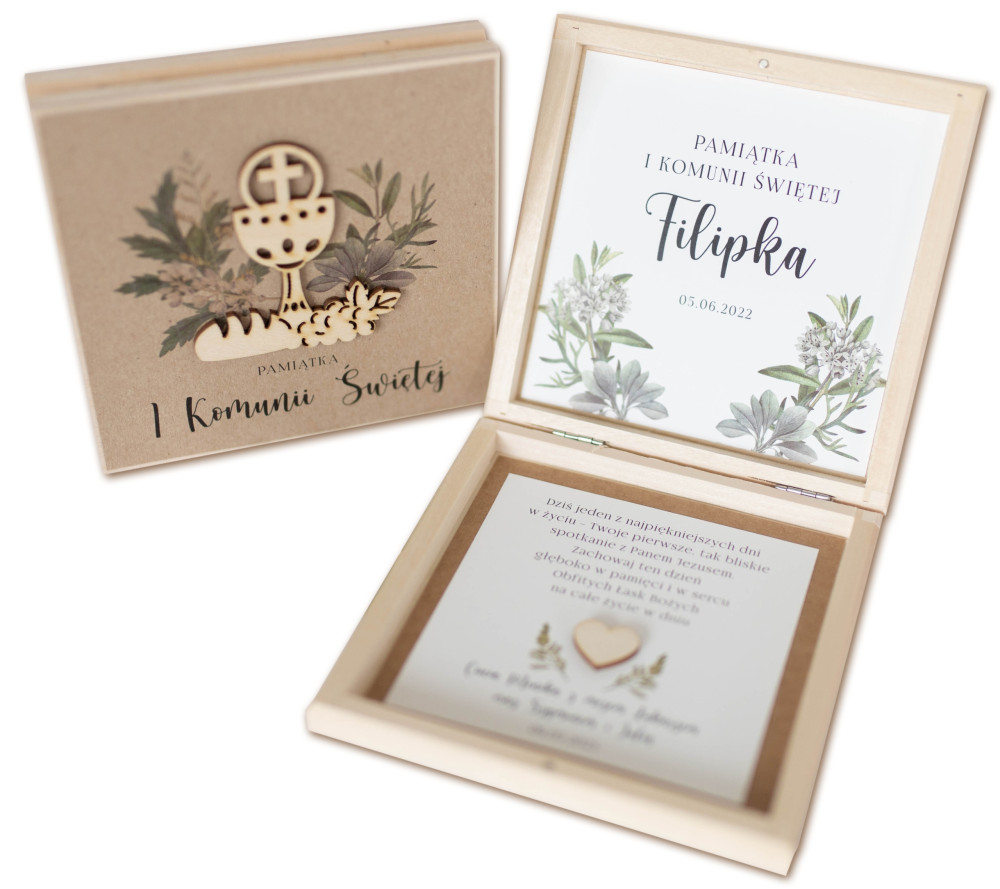 Pudełko posiada ozdobny grawer z zarysem Aniołka oraz napis "Pamiątka I Komunii Świętej" po otwarciu pudełeczko można postawić tak, aby tworzyło piękną ozdobę pokoiku dziecka!