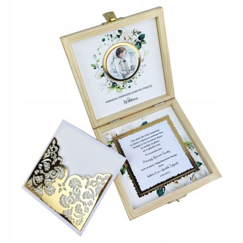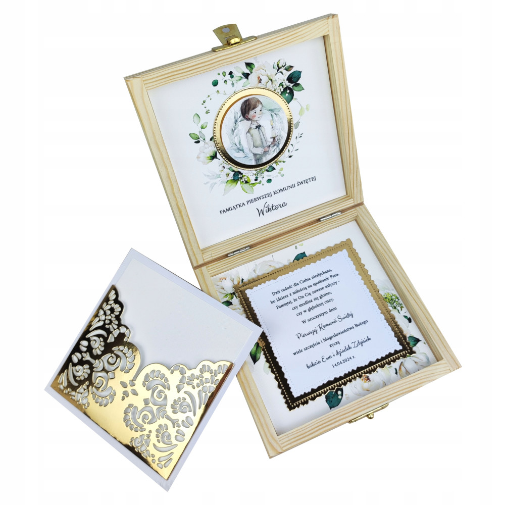 Zapraszam do zakupu wyjątkowego pudełeczka na Pierwszą Komunię Świętą, które zostało stworzone z najwyższej jakości materiałów, aby zapewnić trwałość i piękny wygląd. W środku pudełeczko zostało przyozdobione białym papierem fakturowanym oraz złotym papierem lustrzanym, nadającym mu luksusu i elegancji.