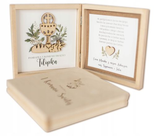 Pudełko posiada ozdobny grawer z zarysem Aniołka oraz napis "Pamiątka I Komunii Świętej" po otwarciu pudełeczko można postawić tak, aby tworzyło piękną ozdobę pokoiku dziecka!