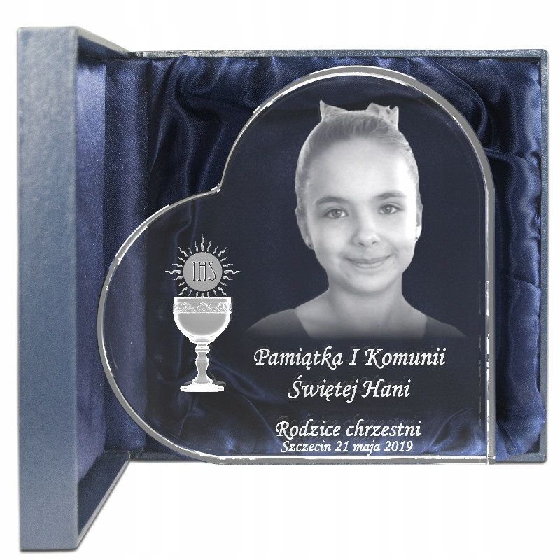 Wygrawerowane laserowo w pięknym kryształowym SERCU zdjęcie wraz z dedykacją od chrzestnej to idealny pomysł na podarowanie dziewczynce wyjątkowej pamiątki na komunię.