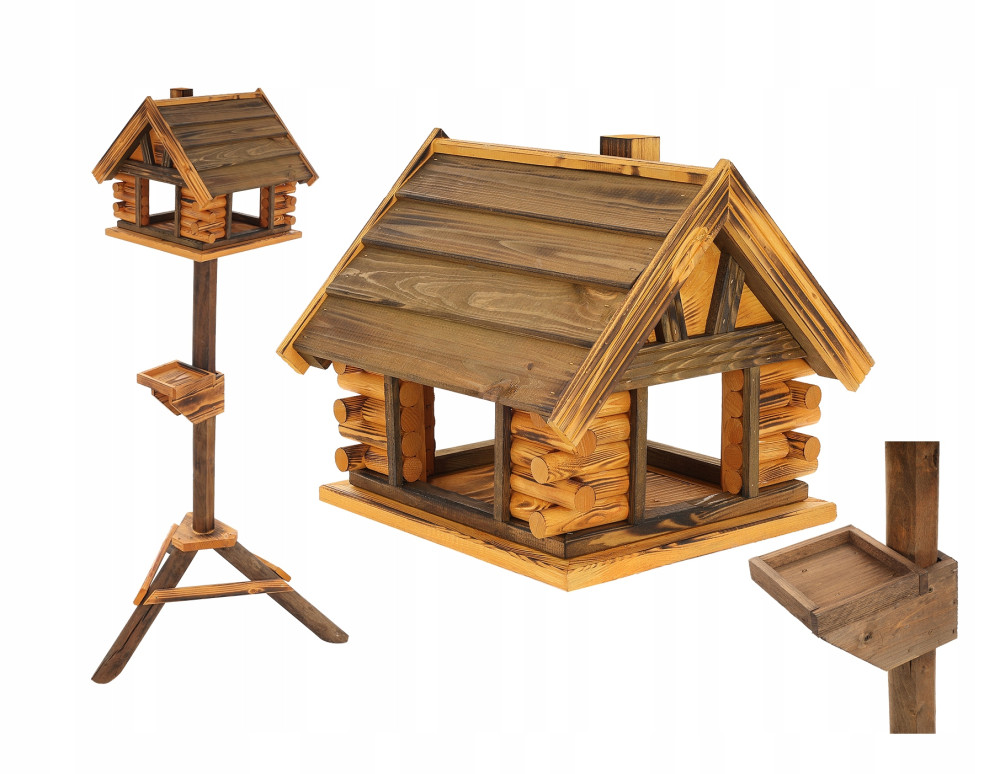 Ozdobny karmnik na stojaku, wykonany ze starannie wyselekcjonowanego drewna, odpowiednio zaimpregnowany (kolor sosna i palisander) oraz opalony. Będzie świetnym wyborem do umieszczenia go w przydomowym ogrodzie, ale i na innych terenach zielonych, gdzie będzie można zapewnić ptakom pożywienie. Proponowany przez nas model został zaimpregnowany i zabezpieczony przed działaniem czynników zewnętrznych, więc niestraszne mu mrozy, deszcz, śnieg czy mróz. Dzięki temu, że model ten wyposażyliśmy w stojak, nie trzeba go przymocowywać na drzewie, a uzupełnianie pokarmu jest znacznie łatwiejsze. Wysokość stojącego karmnika dla ptaków wraz z podstawą wynosi około143 cm.