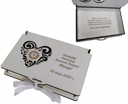 Jest to nasz oryginalny produkt - świetnie sprawdzi się jako pamiątka z okazji Pierwszej Komunii Świętej, która pełni funkcję pudełka na pieniądze otrzymane w ramach Pierwszej Komunii Świętej.