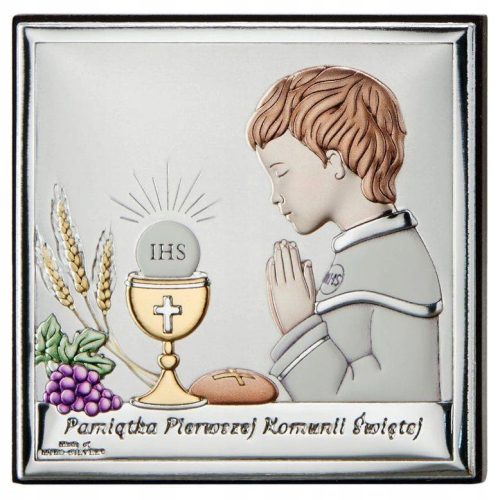Prezentujemy śliczny, posrebrzany i kolorowy prezent na komunię dla chłopca jakim jest obrazek komunijny. Srebrny obrazek "Pamiątka Pierwszej Komunii Świętej" zaprojektowany we współpracy z włoskimi projektantami firmy Valenti, wykonany jest z niezwykłą precyzją i dbałością o szczegóły, co zapewnia wyjątkowość naszego produktu. Obrazek stanowi idealny upominek tej wyjątkowej okazji jaką jest Pierwsza Komunia i może być wręczony od chrzestnej, chrzestnego, od babci, od cioci lub od rodziców.
