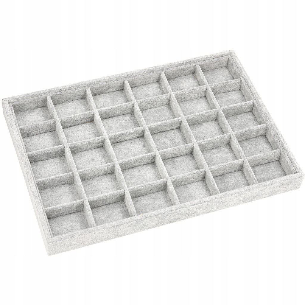 Elegancka i funkcjonalna taca na pierścionki i kolczyki. Wypełniona miękkim materiałem, w kolorze szarym. Posiada aż 30 przegródek na biżuterię.
