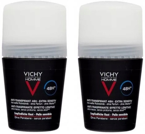 VICHY HOMME Antyperspirant gwarantuje aż 48-godzinną ochronę przed poceniem oraz towarzyszącym mu przykrym zapachem. Formuła oparta na wodzie termalnej z Vichy doskonale koi podrażnienia i nawilża wrażliwą skórę. Jest to innowacyjne połączenie składników aktywnych wzmacniających mechanizm obronny skóry oraz Oligo-Cynku o cennych właściwościach kojących dla złagodzenia podrażnień i dyskomfortu. Antyperspirant nie pozostawia tłustej warstwy i plam na ubraniach. Skład pozbawiony jest alkoholu etylowego i środków zapachowych, dlatego nie powoduje podrażnień ani alergii. Jest hipoalergiczny.