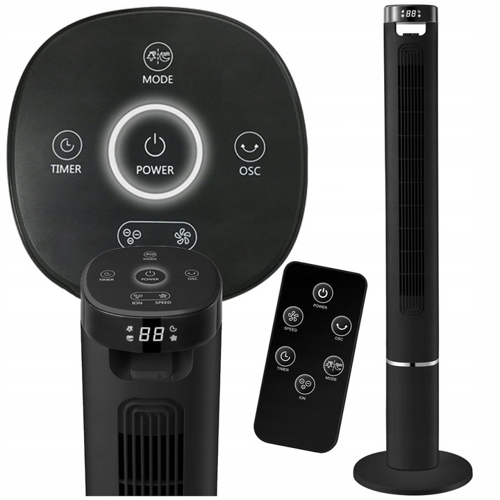 Wentylator kolumnowy cechuje się smukłym designem w kolorze czarnym, który doskonale pasuje do każdej aranżacji wnętrza. Jego elegancka forma sprawia, że stanowi nie tylko funkcjonalny, ale także estetyczny element wyposażenia pomieszczenia.