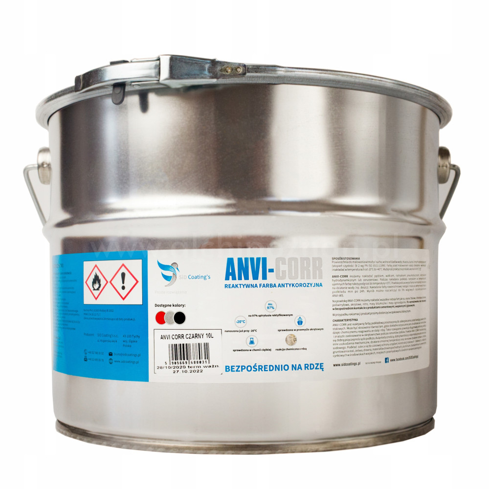 Opakowanie zawiera 10L reaktywnej farby podkładowej ANVI-CORR marki SID COATINGS w kolorze CZARNYM.