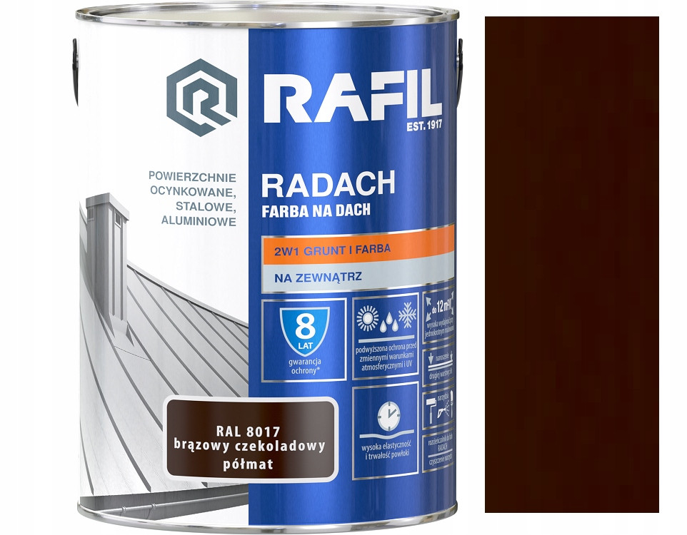 RADACH FARBA NA DACH zapewnia długotrwały efekt dekoracyjny malowanych powierzchni, a w zestawieniu z Rafil PODKŁAD ANTYKOROZYJNY stanowi silne zabezpieczenie przed korozją.