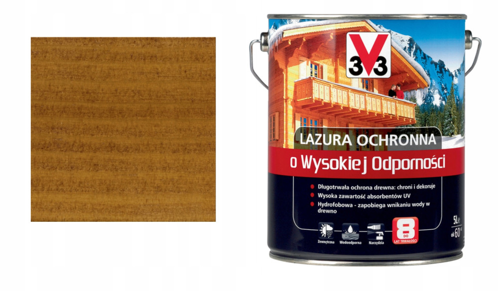 Lazura o wysokiej odporności V33 w odcieniu bezbarwnym zawiera filtry UV i może być stosowana do malowania powierzchni zewnętrznych.