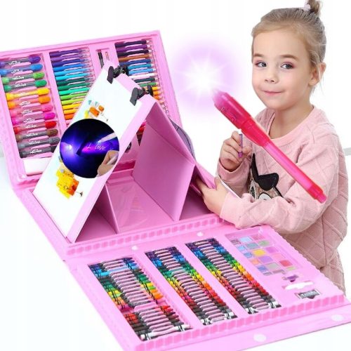 • 208 ELEMENTÓW – przy pomocy ogromnego wyboru  kredek,mazaków, pasteli olejowych,  pasteli świecowych,  farb akwarelowych, temperówki, kleju, korektora, gumki do mazania, kartek a4 z łatwością stworzymy najbardziej wymyślne, kreatywne i oryginalne prace.