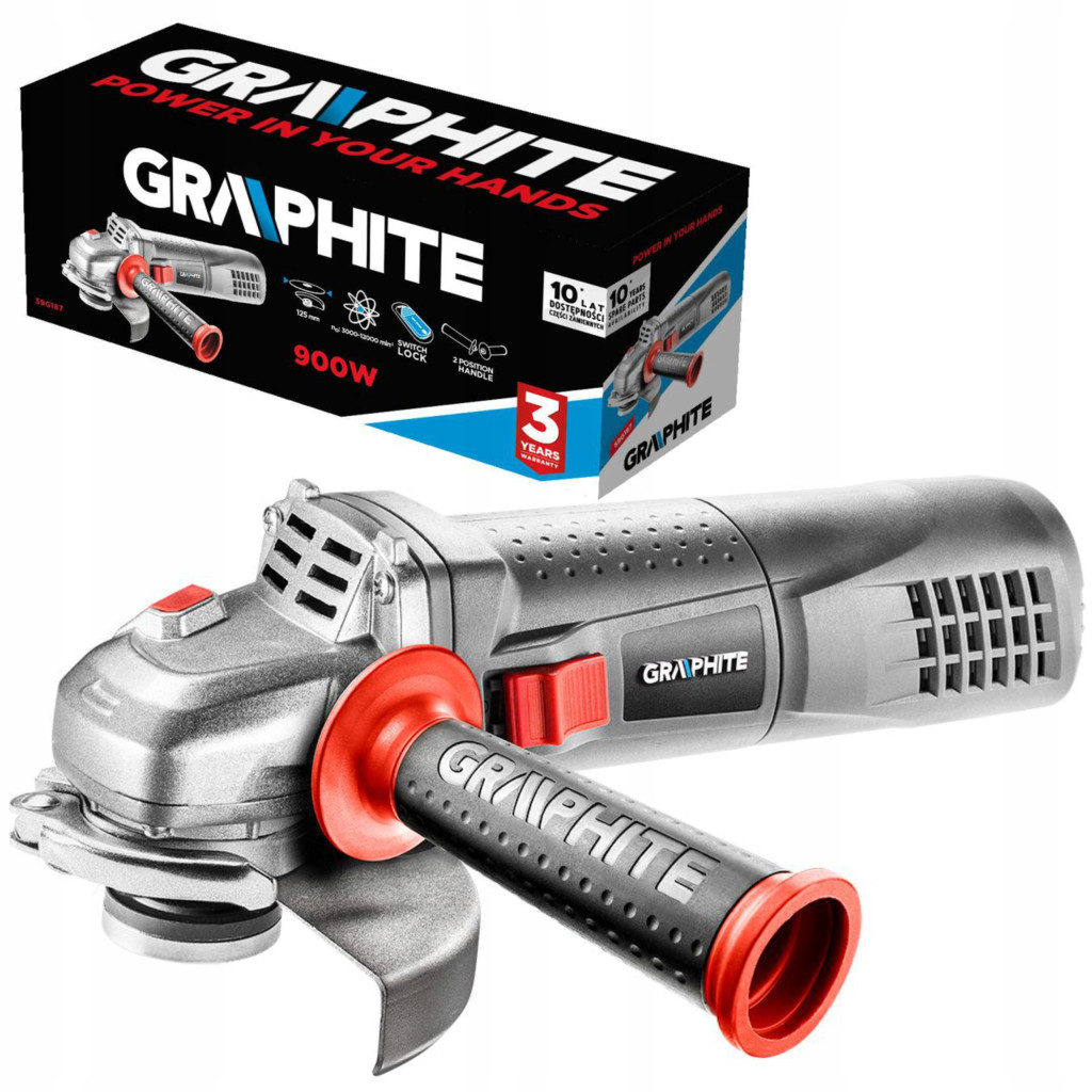 Wysokiej klasy szlifierka kątowa GRAPHITE z silnikiem o mocy 900 W, przeznaczona do cięcia, szlifowania i polerowania materiałów o zróżnicowanej strukturze i twardości. Dodatkowym atutem urządzenia jest możliwość regulacji obrotów w zakresie od 3000 do 12000 na minutę. Funkcjonalność ta będzie szczególnie przydatna w czasie szlifowania różnych materiałów. Tarcza szlifierki o średnicy 125 mm. Urządzenie dzięki ergonomicznemu kształtowi oraz dokładnemu wyważeniu zapewnia wysoki komfort pracy. Istnieje możliwość dwupozycyjnego mocowania rękojeści bocznej. Szlifierka dla bezpieczeństwa została wyposażona w dwustopniowy przycisk z blokadą przypadkowego włączenia oraz niewystający z obudowy przycisk blokady wrzeciona. Odpowiednie rozmieszczenie otworów wentylacyjnych zabezpiecza ją przed przegrzaniem silnika.