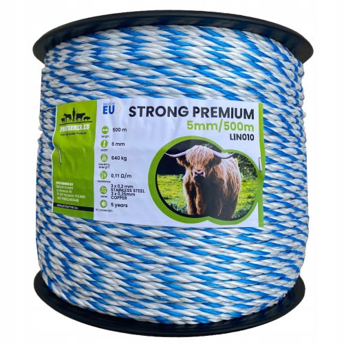 Plecionka STRONG PREMIUM to produkt najwyższej jakości. Druciki z miedzi zapewniają doskonałą przewodność. Grubość 5 mm zapewnia bardzo dużą wytrzymałość na zerwanie. Niebieski kolor gwarantuje najlepszą widoczność dla zwierząt (potwierdzone badaniami). Plecionkę można zastosować na każde zwierzę zarówno na krótkich, średnich i długich ogrodzeniach. Dzięki najlepszym parametrom plecionka ta sprawdzi się w ogrodzeniach elektrycznych stosowanych na najbardziej wymagające zwierzęta: bydło mięsne, dziki, konie.