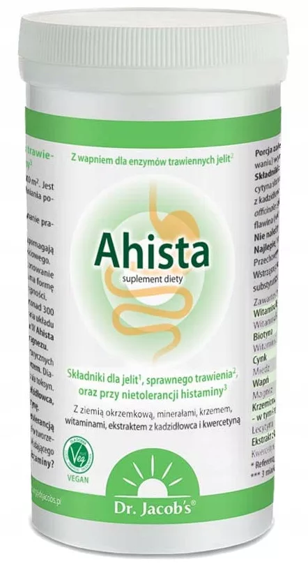 Ahista to produkt ze składnikami dla odżywienia i prawidłowego funkcjonowania błony śluzowej jelit1 oraz sprawnego trawienia2. Zawierający też składniki dla sprawnego trawienia oraz hamowania niekorzystnego działania histaminy (więcej o histaminie pod opisem produktu).