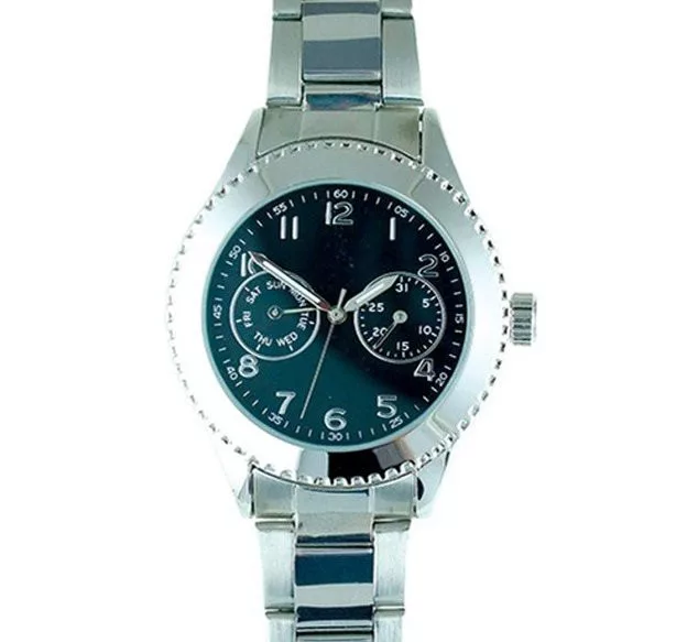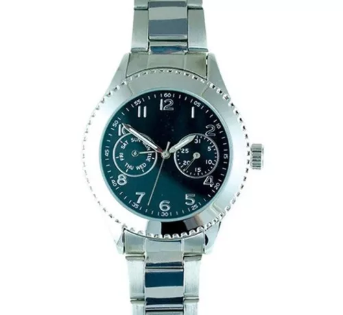 ZEGAREK WYPOSAŻONY W DWIE FUNKCYJNE TARCZE. JEDNA POKAZUJE DZIEŃ TYGODNIA, DRUGA DZIEŃ MIESIĄCA