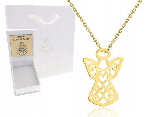 Śliczny łańcuszek komunijny z aniołkiem zapakowany w ozdobne pudełeczko z grawerem
