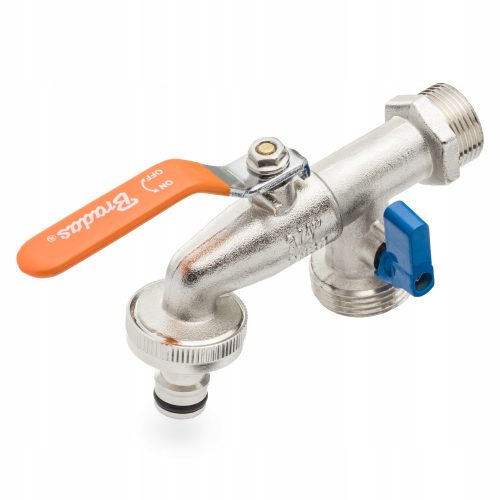 Dwufunkcyjny zawór kulowy wykonany z niklowanego mosiądzu. Wykonany w sposób zapewniający trwałość i bezproblemowe użytkowanie przez długi czas. Dwa zawory pozwalają w wygodny sposób zasilać jednocześnie zasilać dwa punkty.