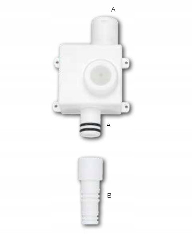 Syfon stosowany w instalacjach do odprowadzania skroplin w klimatyzacji pomieszczeń. Przystosowany do węży do odprowadzania skroplin o średnicy 18mm oraz rur pcv 20mm. Do końcówki B istnieje możliwość podłączenia węża 16mm.