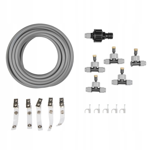 Zestaw zawiera: - 7,5m węża - adapter do szybkozłącza z filtrem - 5x mosiężna dysza zraszająca - 5x uchwyt do mocowania węża - 5x klips do mocowania węża