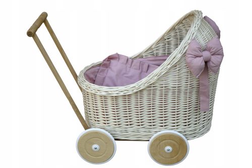Wiklinowy biały wózek z pościelą w kolorze brudny róż - (niemalowany, biel wpadająca w kremowy) - idealna zabawka dla najmłodszych pociech. Może posłużyć do przewożenia lalek, misiów lub innych zabawek.