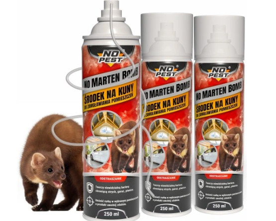 No Marten Bomb è un preparato incolore per la nebulizzazione degli ambienti. La formula  protegge ambienti  come  soffitte, garage, scantinati  dagli attacchi  di martore, donnole, visoni e roditori .