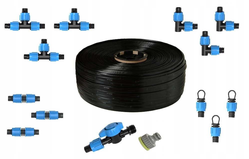 Do zaoferowania mamy Państwu, wielosezonową taśmę kroplującą do nawadniania o średnicy 16mm z emiterem co 10cm grubość 8mil długość 50m z zestawem 14 akcesoriów