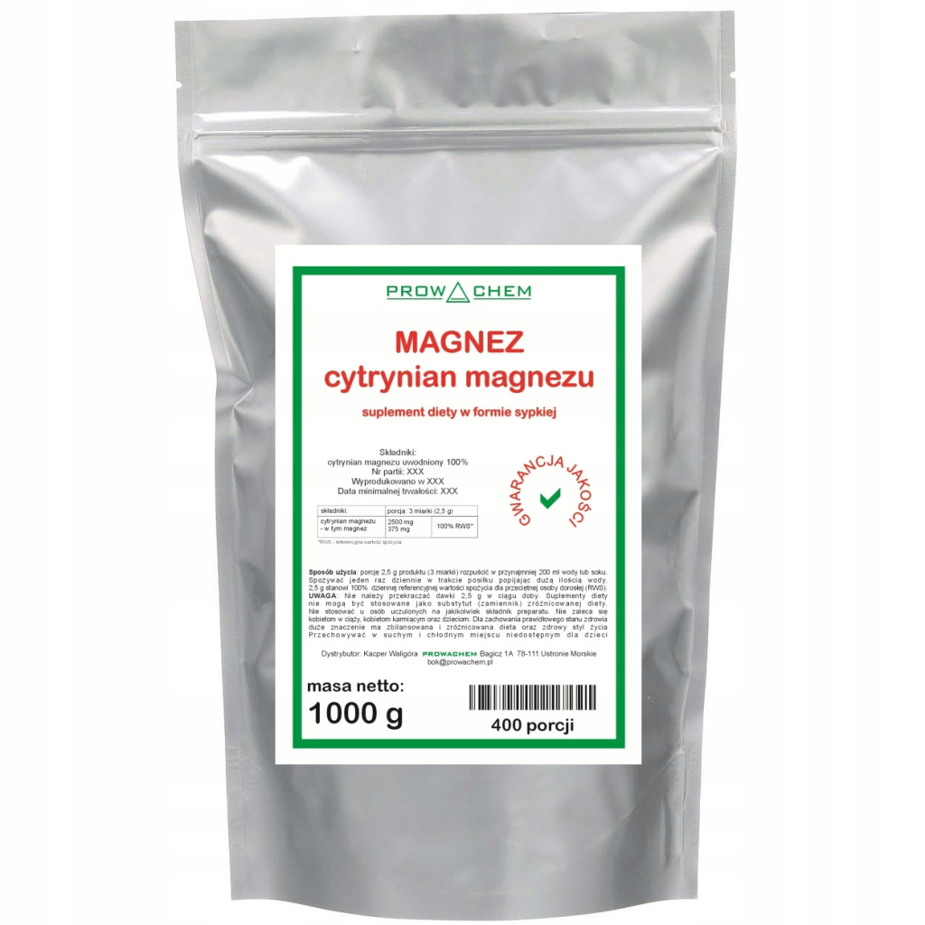 Oferujemy Państwu suplement diety - magnez w bardzo dobrze przyswajalnej postaci cytrynianu magnezu o czystości spożywczej w wygodnej, stojącej torebce strunowej z miarką.
