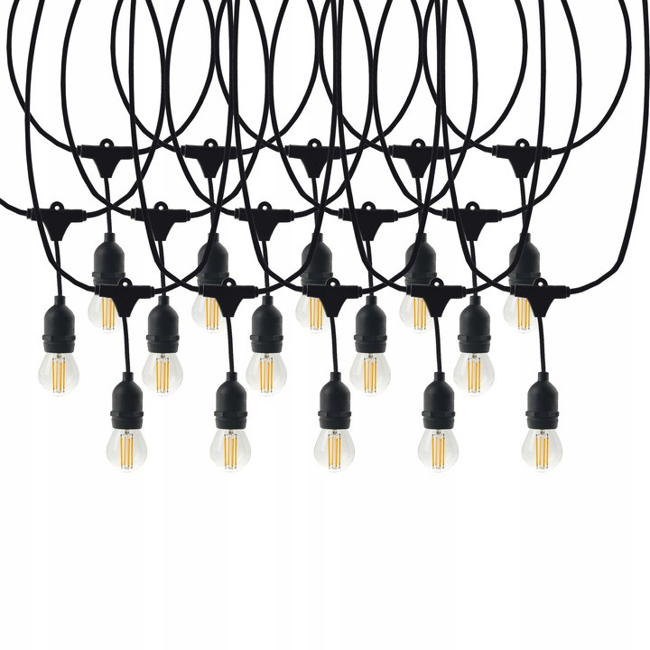 Dekoracyjna girlanda jest przystosowana do stosowania w pomieszczeniach oraz na zewnątrz - w ogrodach, na tarasie czy balkonie. Na długości 15m zostały rozmieszczone 15 gniazd na żarówki E27. Pierwsze gniazdo znajduje się 50cm od wtyczki, następne są do 100cm. Nad każdym gniazdem znajduje się dziurka umożliwiająca podwieszenie girlandy. Możliwość łączenia girland ze sobą nawet do 200m (maksymalna moc 700W).