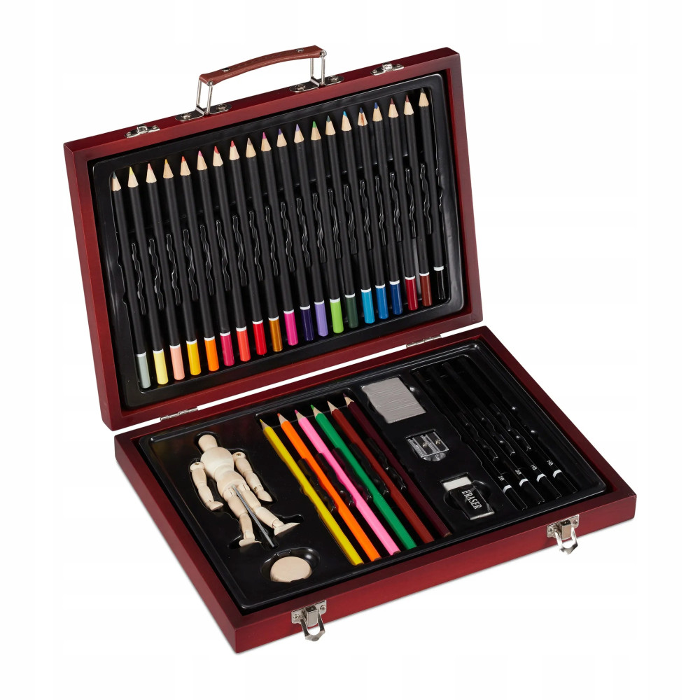 Wykwintna walizka artysty wykonana ze szlachetnego drewna zawiera wszystkie materiały malarskie, które przyspieszają bicie serca. Zestaw idealny dla malarzy hobbystów oraz początkujących, którzy chcą pracować zawodowo. Ustaw drewnianą lalkę z ruchomymi kończynami w żądanej pozycji i zacznij. Cztery ołówki o 2 różnych stopniach twardości nadają się do szkicowania, natomiast kolorowe ołówki w 26 różnych kolorach służą do kolorowania i cieniowania. Chwyć etui i uwolnij swój kreatywny umysł.
