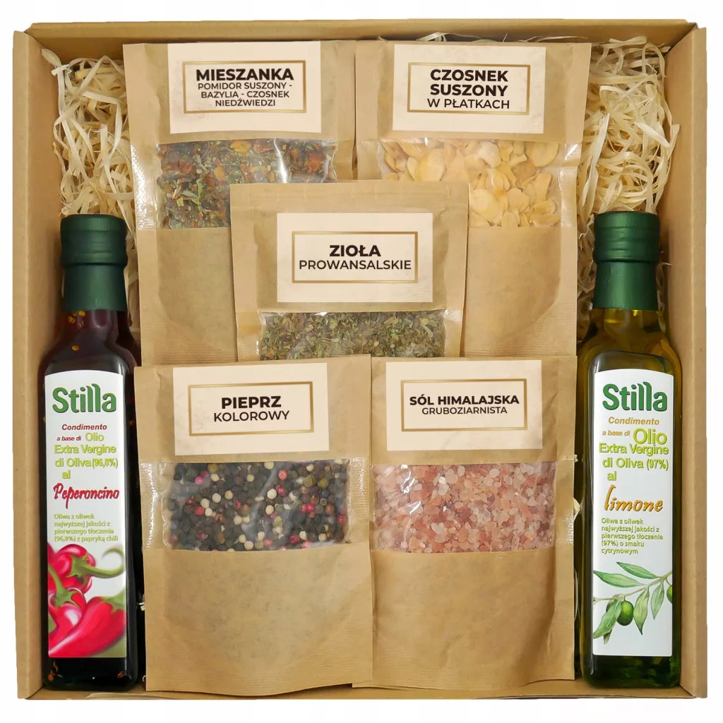 Zestaw najwyższej jakości włoskiej oliwy z oliwek i przypraw, zapakowany w kartonowe ozdobne pudełko z okienkiem i wstążką to piękny prezent - gotowy do wręczenia. Zestaw przydatny w każdej kuchni.