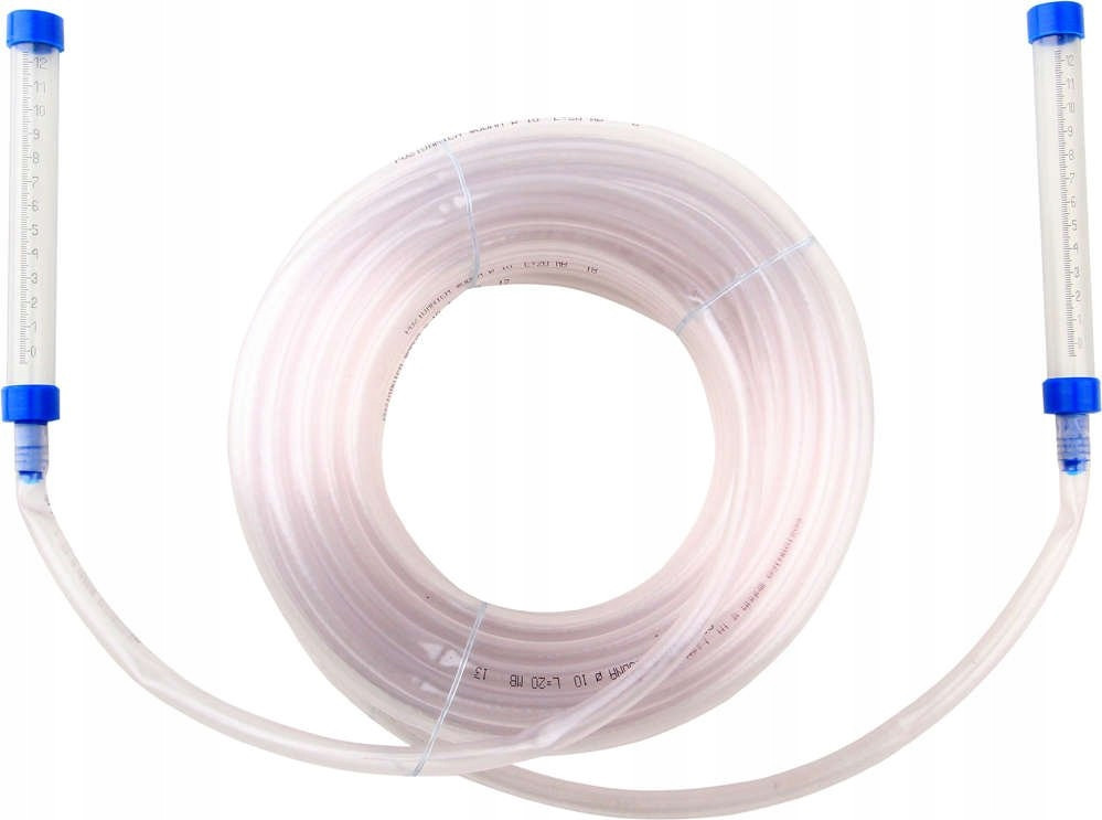 1. Wąż napełnić wodą bez pęcherzyków powietrza, prawie do pełna (pozostawić w kocówkach węża słupki powietrza ok 5-10 cm).