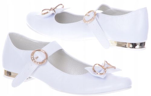 Przepiękne buty do pierwszej komunii świętej, wygodne czółenka/baleriny komunijne. Cholewka wykonana została ze skóry ekologiczne. Buty posiadają ponadto skórzaną profilowaną wkładkę. Lekkie, bardzo wygodne! Wykonane z dbałością o szczegóły. Buciki na białym, niskim obcasie z wstawką w kolorze złotym. Zdobione eleganckimi białymi kokardkami z efektowną  klamrą. Doskonale sprawdzą się podczas uroczystych okazji. Produkt w całości wykonany w Polsce przez firmę MIKO