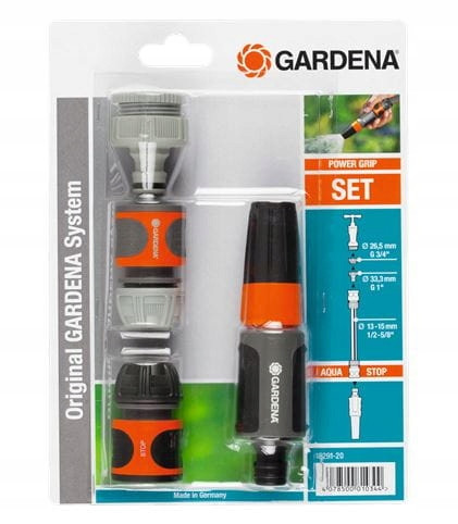 GARDENA zestaw podstawowy zawiera: przyłącze kranowe i adapter (art. nr 18202 i 5305), szybkozłącze (art. nr 18215), szybkozłącze ze stopem (art. nr 18213) oraz zraszacz prosty (art. nr 18300). W komplecie znajdują się wszystkie niezbędne elementy Original GARDENA System wraz z końcówką zraszającą, co umożliwia natychmiastowe podłączenie węża.