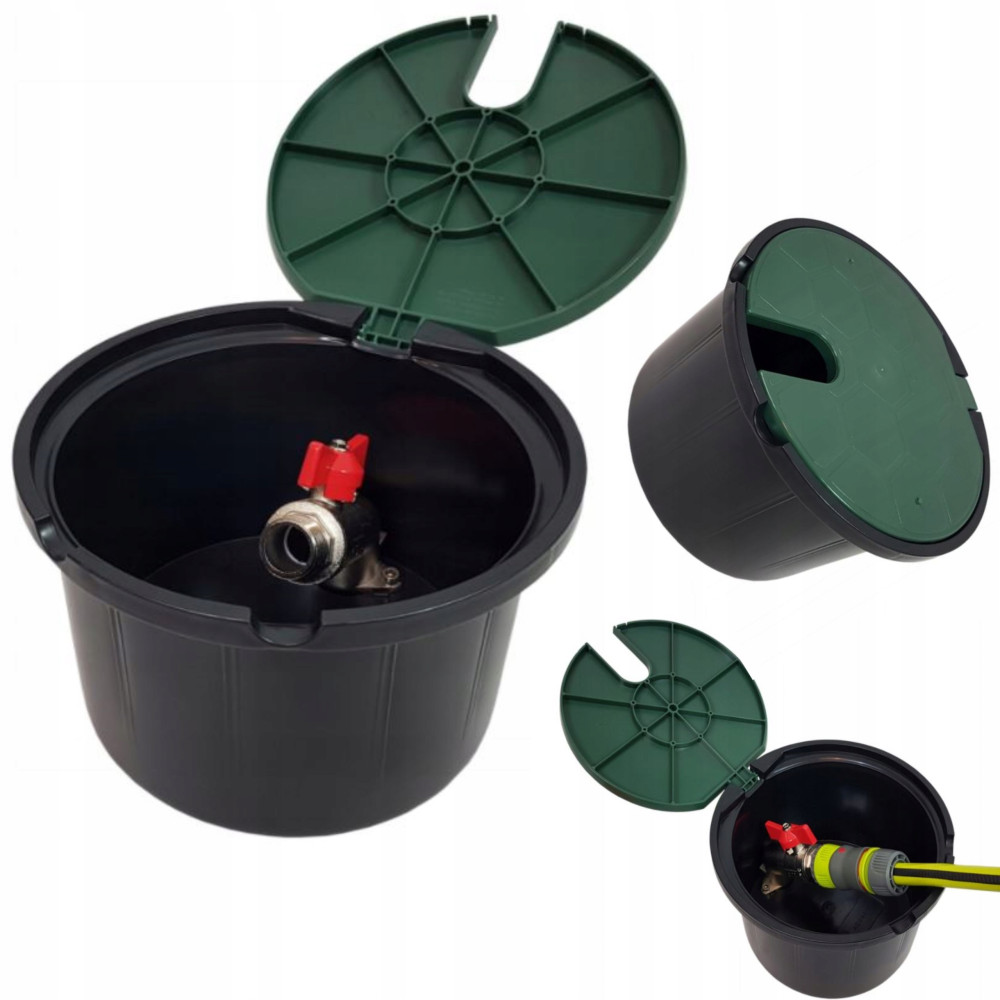 Studzienka poboru wody jest to pojemnik z tworzywa sztucznego z pokrywą zamontowaną na zawias. Wewnątrz studzienki został umieszczony metalowy zawór kulowy. Zawór posiada przyłącza gwintowane 3/4 cala na wlocie jak i wylocie. Studzienkę należy zamontować na równi z gruntem, tak aby było możliwe otwarcie pokrywy. Zalecamy podłączenie studzienki w wodę, wykonać przy pomocy kolana PE GZ 3/4 cala.