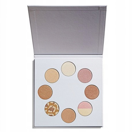 Paleta I Heart Revolution Highlighter Wardrobe od Makeup Revolution składa się z 8 prasowanych rozświetlaczy do twarzy i ciała zamknięte w pięknej, magnetycznej palecie. Są doskonałe do podkreślania szczytów kości policzkowych, łuku kupidyna, kącików oczu oraz  obojczyków. W palecie znajdują się bardzo ciekawe i różnorodne odcienie rozświetlaczy - takie jak biała perła, zimny mroźny róż, miodowe złoto, różowy duo chrom z białym wykończeniem, multi brąz oraz złoto.