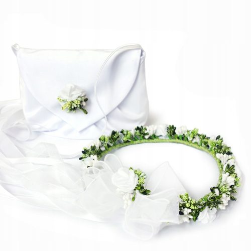 Oferujemy zestaw komunijny dla dziewczynki: TOREBKA + WIANEK. Cena obejmuje oba te produkty: torebka z ozdobą oraz wianuszek komunijny do kompletu.