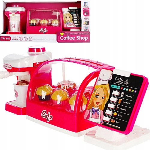 Zawartość zestawu: kasa, witryna z Donatami i babeczkami, ekspres do kawy.