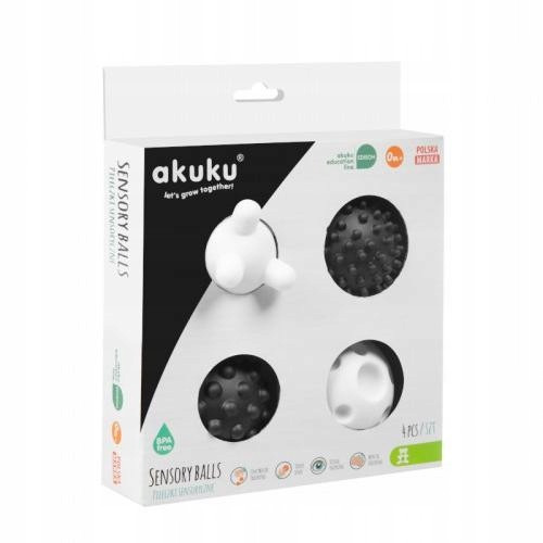 Unikatowe kształty i struktura piłeczek sensorycznych Akuku umożliwiają masaż i rozluźnienie napięcia mięśniowego. Zalecane przez fizjoterapeutów. Dostarczają wielu wrażeń czuciowych. W dodatku czarno-białe kolory doskonale stymulują wzrok niemowlaka, gdyż w pierwszych miesiącach życia dziecko nie rozróżnia barw. Piłeczki posiadają dziurki, dzięki czemu zabawa w wodzie będzie jeszcze fajniejsza.