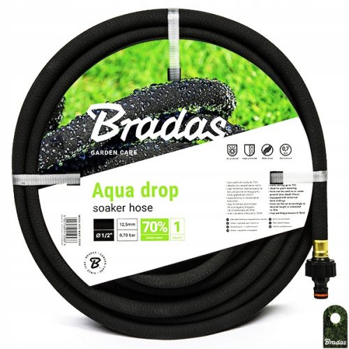 AQUA-DROP - SOAKER HOSE - elastyczny i odporny, wykonany w 100% z przetworzonej gumy wysokiej jakości, dzięki czemu równomiernie przepuszcza wodę na całej długości. Zapewnia oszczędność wody nawet do 70%. Zakute adaptery do standardowych szybkozłączy pozwalają na szybkie i łatwe połączenie z wężem ogrodniczym. Może być przysypany korą lub zakopany pod ziemią na głębokości maksymalnie 20cm. Jest doskonałym rozwiązaniem do dokładnego i oszczędnego nawadniania roślin.