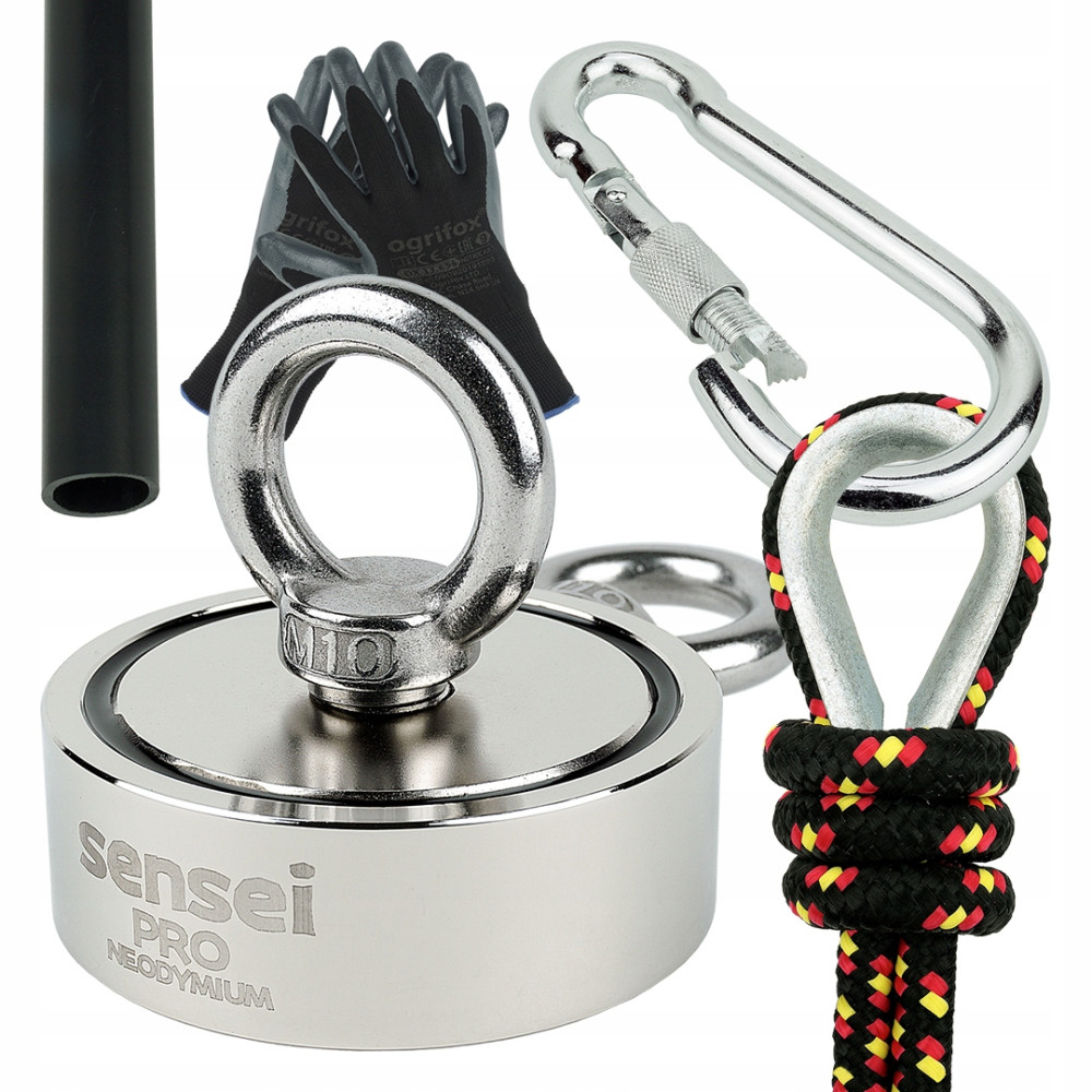 Magnes neodymowy Sensei 500 kg dwustronny (2x250 kg) z dwoma uchwytami + lina 25 m + kausza + karabińczyk + rurka termokurczliwa + rękawiczki
