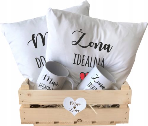 Zestaw składa się z drewnianej skrzynki, w której znajdują się 2 kubki oraz 2 poduszki z nadrukiem. W skrzyneczce znajduje się wełna drzewna, a całość zapakowana jest w celofan.
