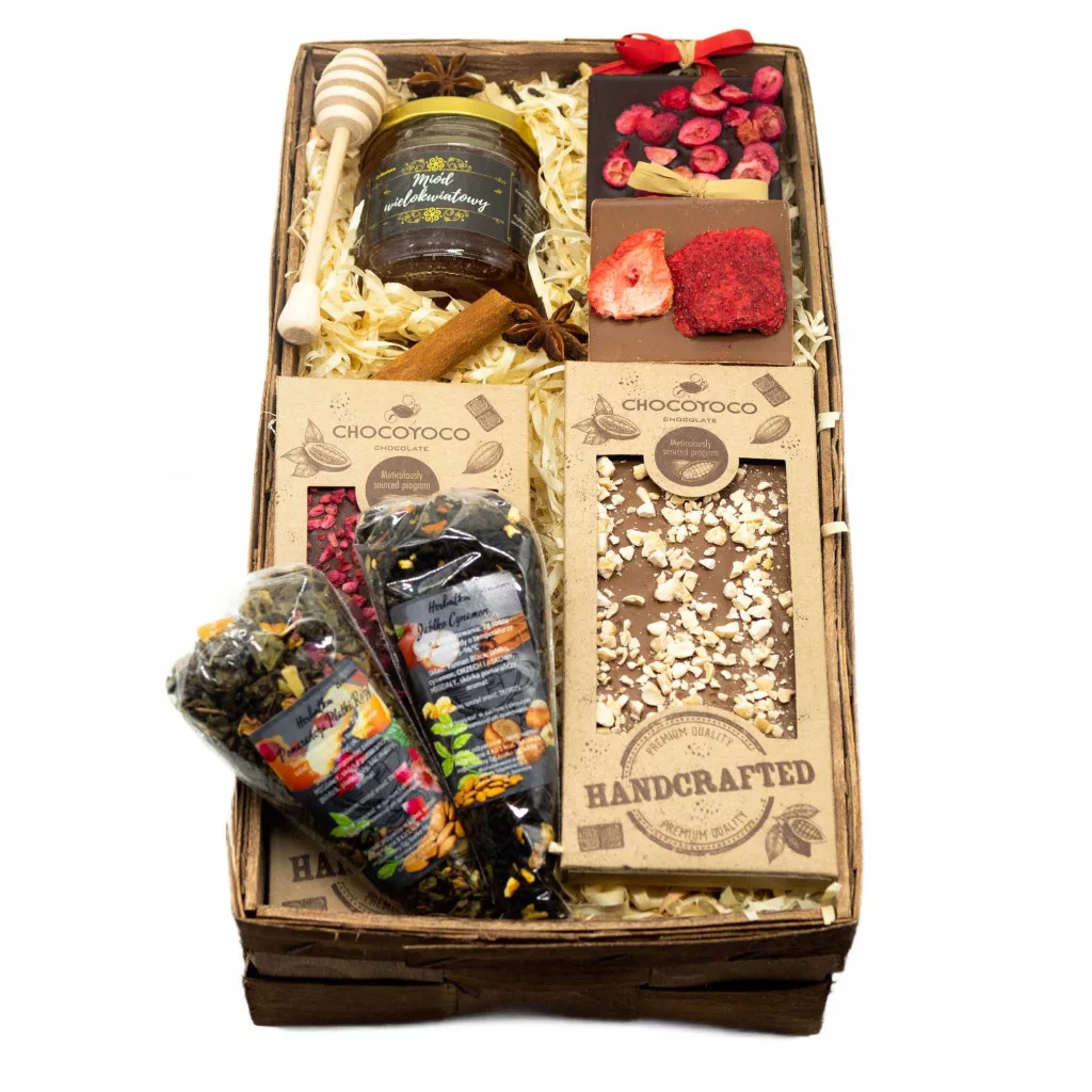 • Wszystkie produkty znajdują się w ręcznie wykonanym koszyku z certyfikowanego (FSC) drewna 35x18x9 cm