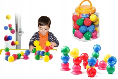 Kolorowe piłeczki, dzięki którym dziecko zaangażuje się w zabawę, a jednocześni poprawi zdolności manualne. Piłki wyposażone są w specjalne przyssawki, które po delikatnym ściśnięciu łączą się ze sobą tworząc w ten sposób różnego rodzaju kształty. Produkt spełnia wymagania norm unijnych, co zostało potwierdzone certyfikatem.